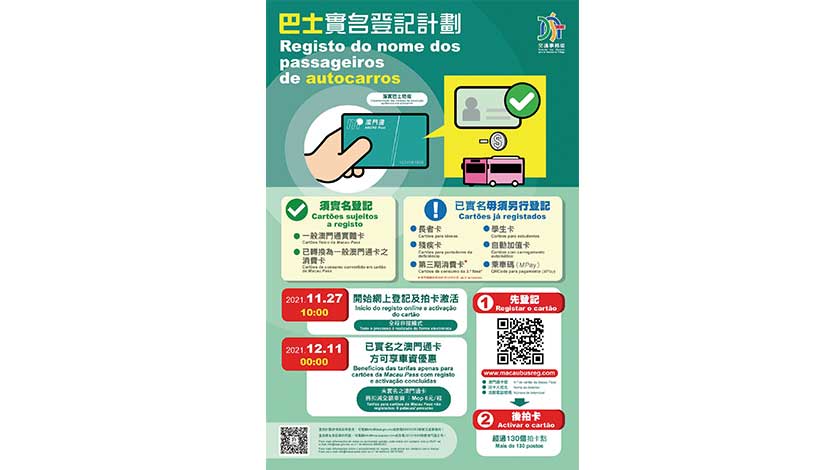 今年12月11日零時起,澳門通卡須經實名登記後方可享有車資優惠,交通事務局呼籲市民配合防疫工作,儘早完成網登和拍卡激活。登入網上登記平台www.macaubusreg.com 填寫資料後,緊記要持卡前往全澳超過130個拍卡點拍卡激活,以完成整個程序。長者卡、學生卡、殘疾卡、自動加值卡、第三期消費卡(消費卡使用期維持至2021年12月31日)及乘車碼(MPay),已具條件聯繫乘車人可毋須另行登記及拍卡。局方提醒,由於市面上流通的澳門通卡種類較多,市民可使用登記平台的查詢功能,了解所持有之澳門通卡狀態,再按照系統提示進行登記或拍卡激活。
