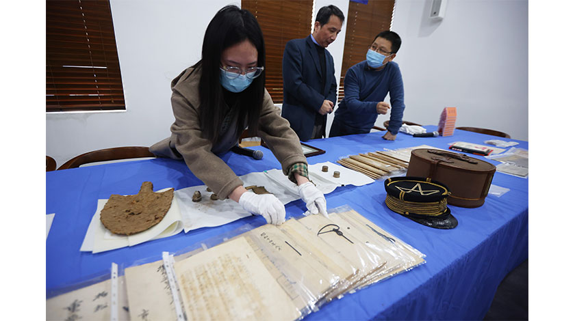12月1日,江蘇省南京市,侵華日軍南京大屠殺遇難同胞紀念館舉行『2021年新增文物史料新聞發佈會』,包括侵華日軍『戰鬥詳報』『陣中日誌』以及南京保衛戰戰場遺跡發現的中國守軍鐵鍬、子彈等在內的一批文物史料共35件(套)入藏該館。圖為工作人員整理新增文物。中新社