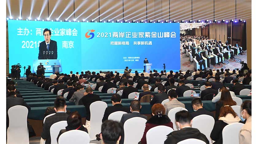 12月7日,2021兩岸企業家紫金山峰會在南京和台北兩地同時連線舉行。峰會大陸方面理事長郭金龍在開幕式上指出,經濟合作是兩岸融合發展的堅實基礎,要持續探索兩岸融合發展新路,率先同台胞台企分享大陸發展機遇、提供更多同等待遇,持續推進法治化營商環境建設,促進各項惠台利民政策措施落實、落細。(中新社)