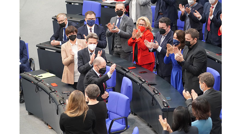 12月8日,德國聯邦議院以395票選舉社民黨政治人物朔爾茨為下屆德國總理。德國在默克爾執政十六年後迎來了一位新總理。朔爾茨生於1958年,曾任漢堡市長、德國副總理兼財政部長。圖為朔爾茨當選後起身揮手致意。中新社