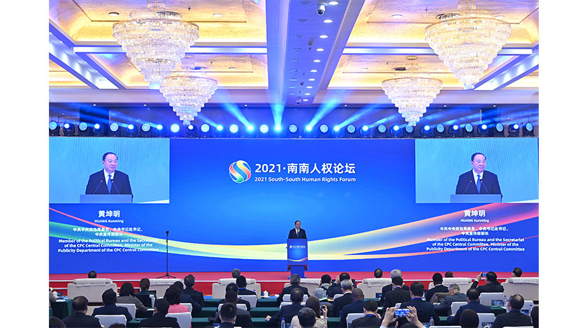 12月8日,2021•南南人權論壇在北京開幕,本次論壇的主題是『人民至上與全球人權治理』。中共中央政治局委員、中宣部部長黃坤明出席開幕式,宣讀習近平主席賀信併發表主旨演講。中新社
