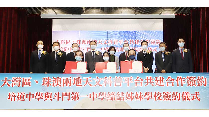 【特訊】12月15日,培道中學隆重舉行『大灣區、珠澳兩地天文科普平台共建合作簽約暨培道與斗門一中締結姊妹學校簽約儀式』。澳大副校長及南京大學粵港澳大灣區校友聯盟會葛偉會長和斗門一中袁長林校長簽訂天文科普平台共建合作協議書,三方將致力建造科普共享平台,推動大灣區、珠澳兩地的天文研習發展,深化教學成效和人才培養,及後李校長與袁校長簽訂締結姊妹學校,商定共同推進珠澳兩地師生的交流,建立互學共進和教學經驗分享的合作。