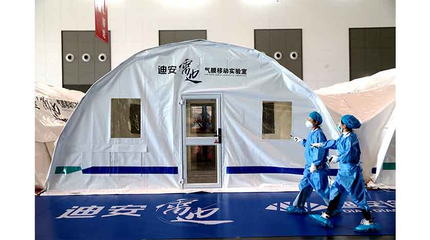 12月22日,在位於陝西西安的西安國際會展中心內,兩套用於核酸檢測的氣膜實驗室正式啟用,每日最高檢測產能可達25萬管。圖為工作人員從實驗室前走過。 中新社