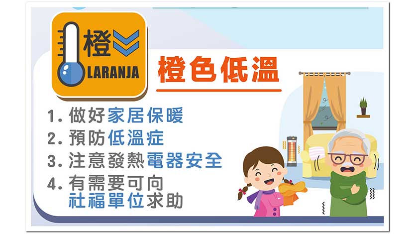 氣象局亦發出橙色低溫提示,並稱今日最低氣溫下降至攝氏八度或以下,呼籲市民做好禦寒措施,注意保暖,包括要增添禦寒衣物及做好家居保暖等防寒措施,使用熱水器或電暖爐等器具時應注意室內空氣流通及使用安全等。
