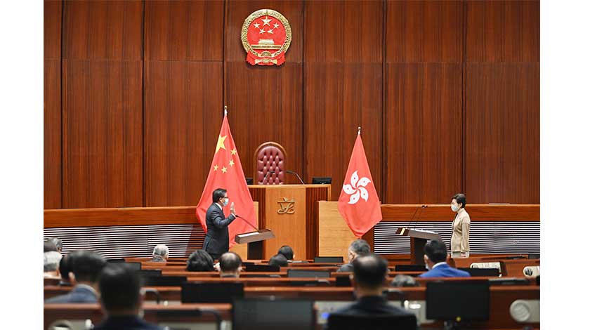 完善選舉制度的下的首場立法會選舉去年12月19日投票,選出的90位議員在本次宣誓中有不少亮點,首次由特首親自監誓;首次在宣誓儀式上奏唱國歌;首次在國徽下宣誓;首次宣誓人必須穿商務服裝;首次全場口罩下宣誓。