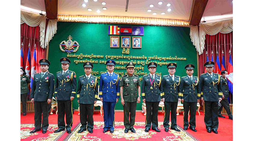 1月5日,柬埔寨王家軍在金邊為中國人民解放軍第十二批援柬院校專家組舉行授勛儀式,以表彰專家組為柬王家軍陸軍學院建設發展作出的貢獻。圖為參與活動的部分中柬代表合影。中新社