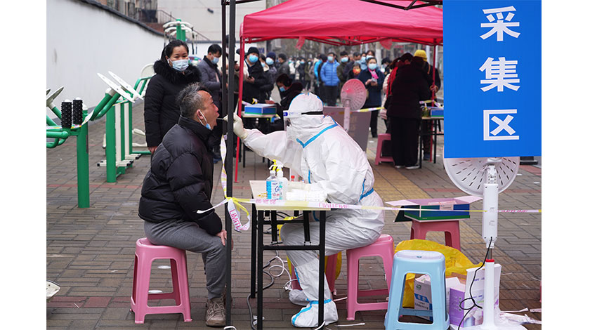 1月7日,鄭州順河路一核酸採集點,醫護人員在為市民做核酸檢測。當日,鄭州市開展第二輪全員核酸檢測。 中新社