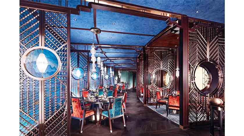 餐廳的設計以中國古典園林為靈感,移步易景,別有洞天,引領賓客踏上充滿驚喜的發現之旅。大廳用餐區採用冷色系為主色調,烘托出月色如水的婉約氛圍,彷彿能看到湛藍水面上波光粼粼,水中月,楊柳枝,荷花葉,交相輝映,栩栩如生。旁邊用餐區域的金黃色牆則結合鍍金和手工刺繡的桂花圖案,尊顯高貴優雅。為迎合注重私密性的饕客,餐廳還設有三個私人包廂,是舉行宴會或特別活動的完美選擇。