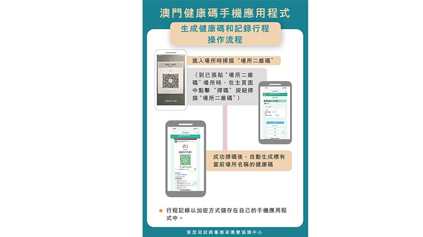 為有效應對疫情,「澳門健康碼」手機應用程式巳可掃描用作記錄行程的場所碼。現時,全澳巳張貼場所碼的場所包括所有政府機構、社會服務設施、衛生局轄下醫療場所以及公共巴士;下一階段將爭取在1月底前在全澳醫療場所、飲食場所、娛樂場所張貼場所碼供居民記錄行程,並要求有條件的場所提供健康碼反掃服務。屆時,居民除可使用手機應用程式主動正掃場所碼,亦可向場所提供健康碼作反掃。當局會持續觀察掃碼使用情況,逐步推動公眾和場所實行行程記錄操作。