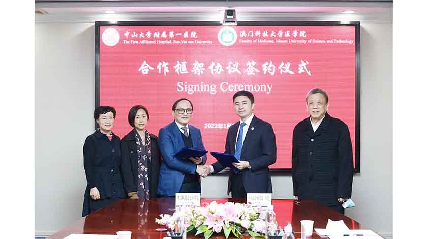 【特訊】澳門科技大學醫學院與中山大學附屬第一醫院(下稱「中山一院」),於2022年1月13日在廣州市中山一院院史館三樓會議室進行合作協議簽字儀式,雙方為加強醫療事業的發展和交流,經友好協商,本著「互相支援,友好合作,互利雙赢」的原則達成協議。