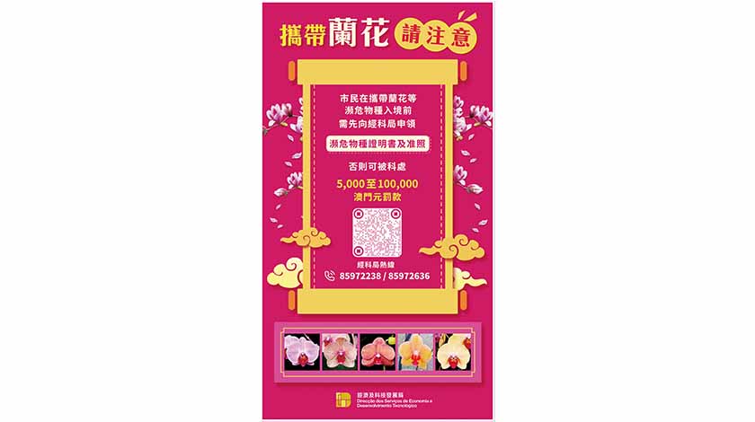 【特訊】農曆新年將至,巿民常會從內地購買年花回澳。經濟及科技發展局提醒,市民在攜帶蘭花等瀕危物種入境前,需先向經科局申領瀕危物種證明書及准照,否則可被科處最少5000澳門元罰款。
