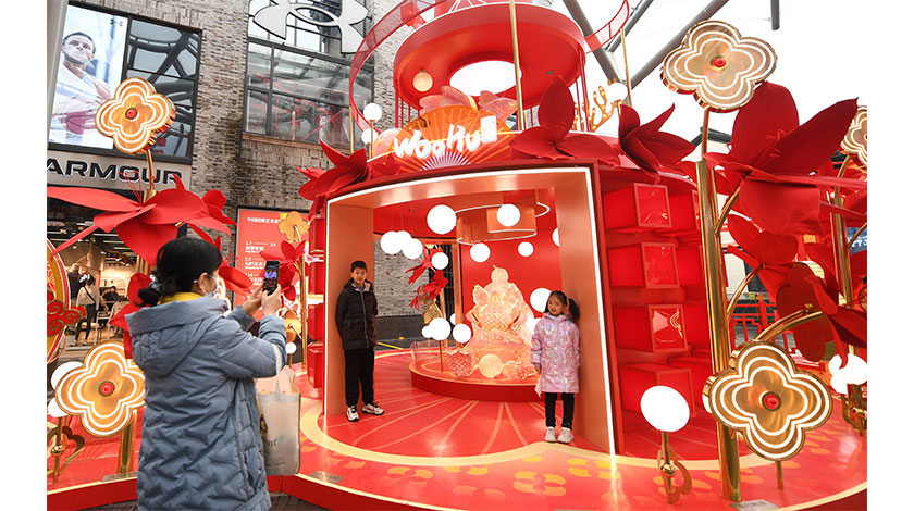 1月24日,杭州西湖邊一商業體內的喜慶裝飾吸引遊人拍照。春節臨近,浙江杭州城區各類喜慶裝飾陸續亮相,營造出濃鬱的節日氛圍。 中新社