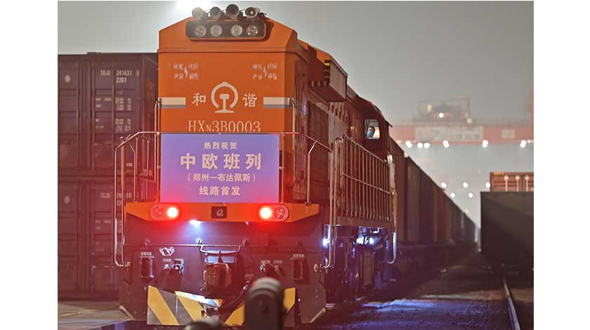 鄭歐班列開闢歐洲新線路 首發開往匈牙利 1月28日,河南鄭州,X8003次中歐班列從中國鐵路鄭州局集團有限公司圃田站啟程,滿載著機械設備配件、電子元器件及醫療衛生用品等貨物駛向匈牙利首都布達佩斯。這是鄭州首次開行發往布達佩斯的中歐班列,也是中歐班列(鄭州)(又稱鄭歐班列)在2022年開闢的歐洲新線路。(中新社)
