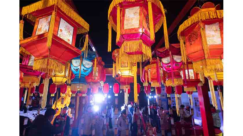1月29日晚,江蘇省南京市天妃宮與台灣新北市三重先嗇宮共同舉行2022兩岸同賀新春“雲點燈”活動。兩岸同胞跨越海峽相聚“雲端”,共同點亮花燈、暢叙親情。圖為南京天妃宮活動現場。 中新社