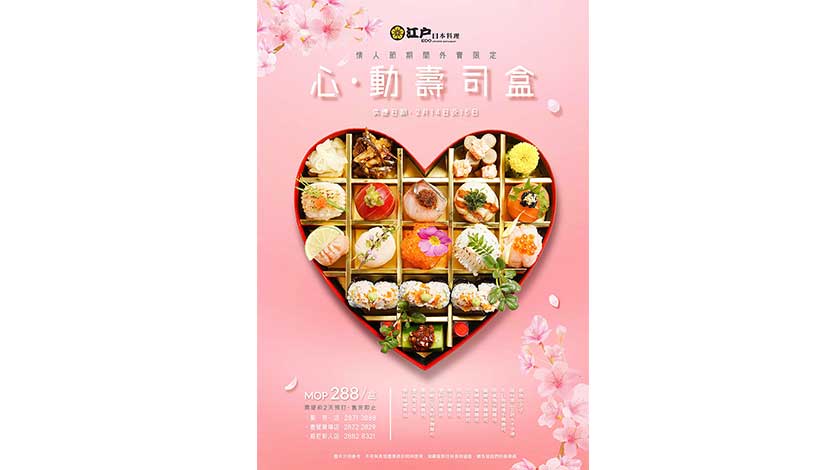 另外,江戶日本料理(葡京店、壹號廣塲店、威尼斯人店)於2月14及15日更特別推出外賣壽司別注版--「心。動壽司盒」($288,須提前2天預訂),心心造型的壽司盒內藏多款精緻壽司,讓您與情人兩口子在家中靜享溫馨時光,但別忘了加上一束鮮花,一瓶香醇美酒,營造浪漫氣氛。