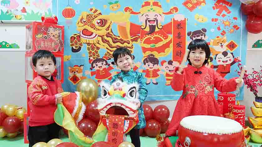 在導師的協助下,幼兒繪畫出色彩鮮麗的桃花樹,並一起擺放賀年全盒食品,懸掛賀年飾物,張貼恭賀揮春;幼兒們穿上色彩鮮艷奪目的中國傳統服飾,認識各種祝賀語句,互相祝賀拜年及品嚐各式各樣的賀年食品、糖果,嘗試敲打鑼鼓、舞動獅頭,接觸新春傳統風俗的事物;導師又籍此向他們講解春節的由來和故事,增加幼兒對節日及中國傳統文化的認識;托兒所還選用了天然有機的材料,讓導師與幼兒一起製作七彩湯丸,寓意新春佳節團團圓圓。所內洋溢著濃厚的節日氣氛,場面溫馨熱鬧,歡笑聲處處。