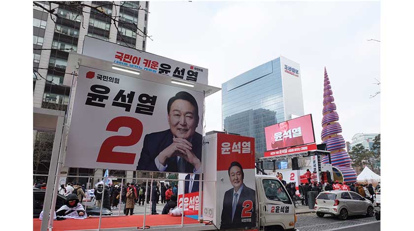 當地時間2月15日,第20屆韓國總統選舉拉票活動正式啟幕。在未來22天內,14名總統候選人將周遊全國拜票,開啟拉票大戰。圖為當日,在野黨國民力量尹錫悅及其競選團隊在首爾清溪廣場拉票。( 中新社)