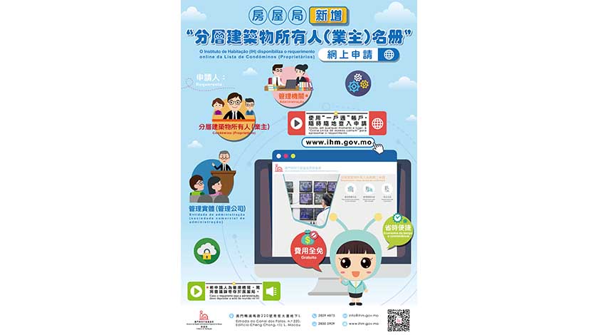 此外,房屋局因應近年分層建築物管理制度、都市建築及樓宇防火安全相關法律制度的落實,日前制訂了“分層建築物管理規章範本”(電子版),內容涵蓋樓宇共同部分之使用及管理、分層建築物所有人權利及義務、管理服務、保險、管理機關、財政制度及基金等,已上載於房屋局網頁(www.ihm.gov.mo),歡迎市民下載及參閱。
