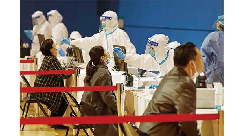 3月14日,居民有序進行核酸檢測採樣。為了滿足居民的核酸檢測需求,當日,上海市黃浦區盧灣體育場臨時核酸檢測點正式啟用。 中新社記者 殷立勤 攝
