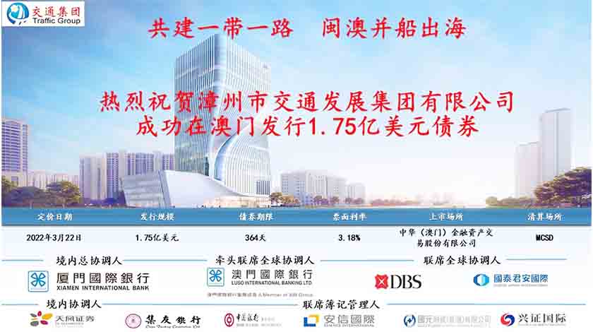 【特訊】2022年3月22日,澳門國際銀行成功服務福建省漳州市交通發展集團有限責任公司在澳門發行1.75億美元公募債券。這是繼3月10日該行成功服務福建晋江城建赴澳发债融资後,推進閩籍企業赴澳發債的又一個突破性成果,是澳門中央證券托管結算系統(MCSD)啓動以來全國地級市首單赴澳門市場發行的債券,亦是MCSD啓動以來全國非金融類企業發行的最大發行規模及最低票面利率的債券。