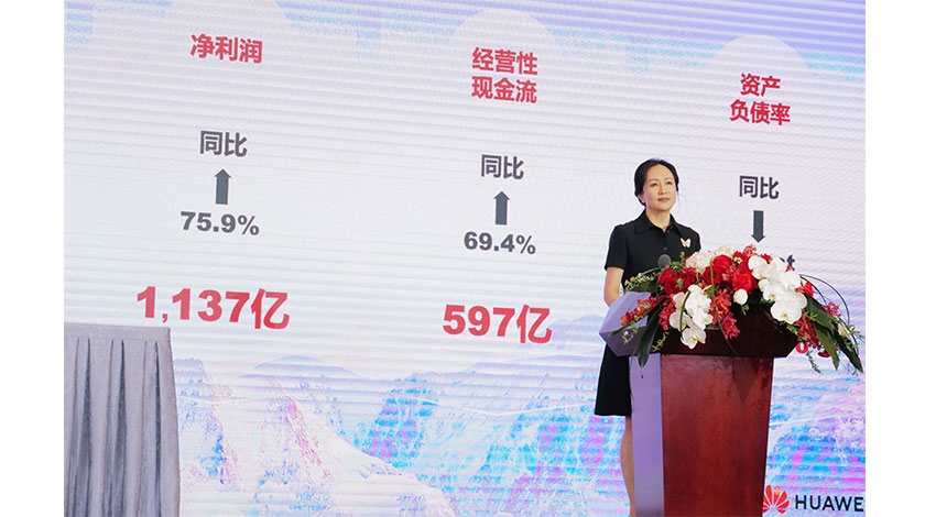 3月28日下午,華為2021年年度報告發佈會在深圳舉行。報告顯示,2021年,華為實現全球銷售收入6368億元人民幣,淨利潤1137億元人民幣。圖為華為首席財務官孟晚舟在發佈會上。 中新社