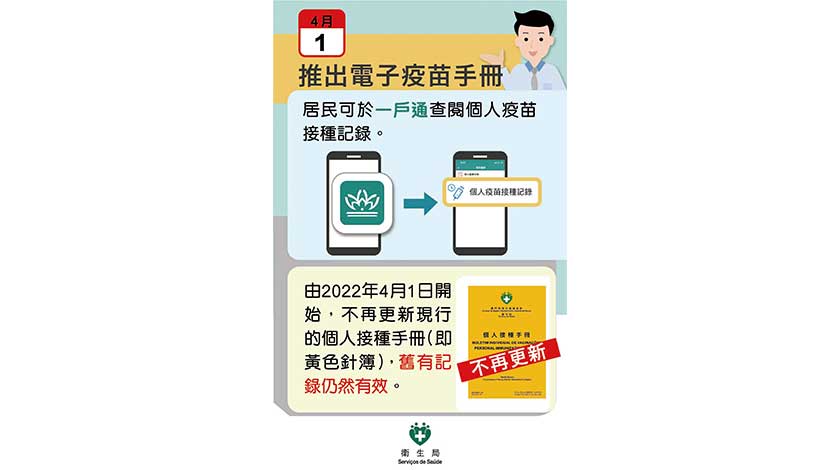 為配合推動電子政務,衛生局設立防疫接種紀錄電子服務平台,並提供個人接種手冊的數碼格式,並自4月1日起推出「電子疫苗接種手冊」,居民可在「一戶通」內查閱個人疫苗接種紀錄,衛生中心亦可協助有需要的居民列印。故此,由4月1日起,現行的個人接種手冊(俗稱「黃色針簿」)將不再進行更新,但舊記錄仍有效。