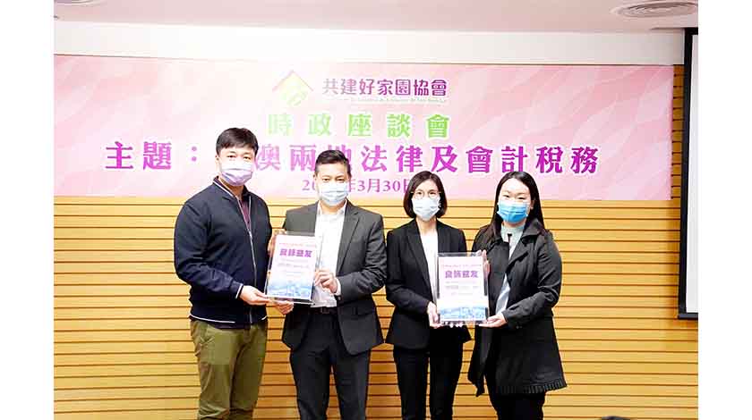 【特訊】為了加深社會對粵澳深度合作區的認識,共建好家園協會於日前在婦聯綜合服務大樓三樓舉行好家園時政座談會,主題為“琴澳兩地法律及會計稅務”。座談會由立法議員、共建好家園協會理事長黃潔貞主持,邀請橫琴粵澳深度合作區法律事務局代理局長鍾頴儀、財政局代理副局長郭日海擔任主講嘉賓,與會員和市民共同探討深合區法制建設及稅務優惠等。主辦方期望藉此提升社會對深合區的認知,吸納居民聲音和意見,為推動深合區建設建言獻策,促進深合區繁榮穩定發展。
