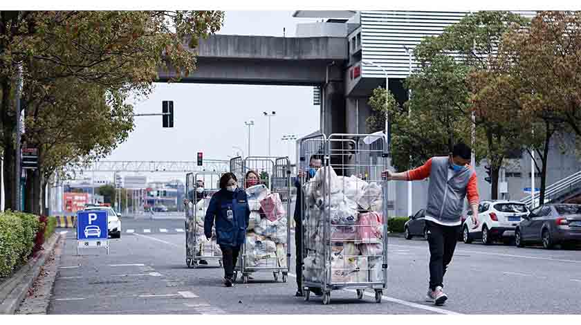 4月1日,盒馬鮮生門店工作人員將社區居民的團購物品送至小區指定擺放區域。當前,上海在落實疫情防控各項措施的前提下,積極協調保供企業拓寬採購渠道,開展批零對接、產銷對接,增加採購量,確保市民生活物資供應。 中新社