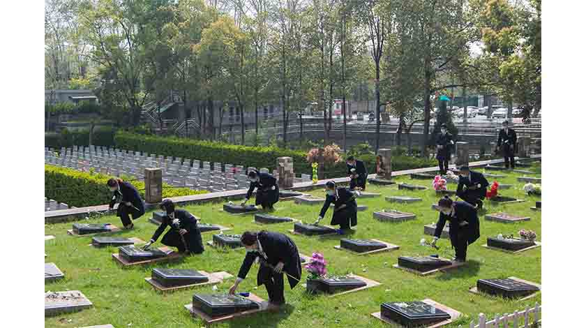 4月4日,江蘇南京,雨花台功德園工作人員在祭掃。當日,2022年雨花台功德園清明節集體代祭掃儀式舉行。 中新社