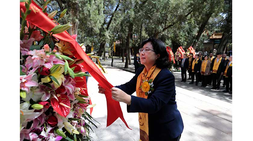 4月5日,壬寅(2022)年清明公祭軒轅黃帝典禮在陝西黃陵縣舉行,數百名炎黃子孫齊聚橋山緬懷人文初祖軒轅黃帝,以表慎終追遠的虔誠心意及對中華民族復興的祈盼。圖為陝西省人民政府僑務辦公室主任周玉峰出席典禮並代國務院僑務辦公室敬獻花籃。 中新社