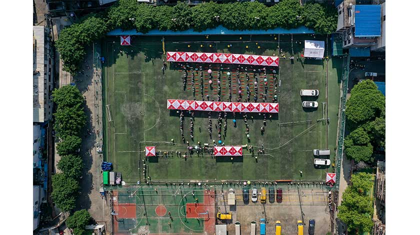 4月10日,民眾在廣州海珠區鷺江社區足球場核酸採樣點有序排隊,接受核酸檢測。當日下午舉行的廣州市疫情防控新聞發佈會通報,4月9日8時至4月10日14時,廣州市新增21例新冠病毒本土感染者,另有1例此前發佈的無症狀感染者轉確診。目前,廣州市首輪全員核酸篩查基本完成,10日下午開始,部分區域再次組織新一輪的核酸篩查。(無人機照片) 中新社記者 陳驥旻 攝