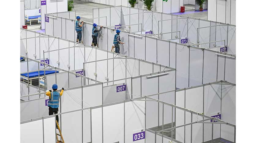 4月10日晚,施工人員在廣州琶洲會展中心建設方艙醫院。廣州市根據規劃部署,目前正在琶洲會展中心推進建設方艙醫院。 (中新社記者 陳驥旻 攝)