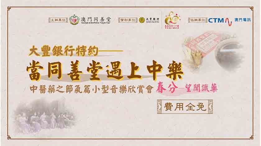 【特訊】為慶祝同善堂成立一百三十週年和答謝社會各界善長一直以來的支持,由同善堂主辦、大豐銀行特約贊助、澳門電訊協辦的「當同善堂遇上中樂—中醫藥之節氣篇小型音樂欣賞會」將於4月17日在同善堂歷史檔案陳列館舉行首場音樂會「春分—望聞識藥」。
