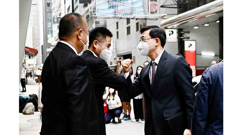 4月11日上午,香港特區政府政務司前司長李家超到訪港區省級政協委員聯誼會、香港友好協進會、香港經濟民生聯盟、自由黨、新民黨,聽取各界人士的意見,並解釋施政理念。圖為李家超(右)到訪港區省級政協委員聯誼會。(中新社)