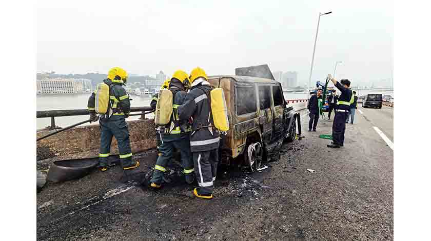 昨日上午八時許,一輛名貴越野車沿友誼大橋,氹仔往澳門方向行駛,期間越野車右後輪胎爆破,懷疑駕駛者未有察覺繼續駕駛,胎皮鬆脫後轆鈴與路面不斷接觸磨擦並產生火花,當越野車繼續駛至近澳門引橋路段時,不斷磨擦轆鈴產生的火花和熱力燒著車尾部位。駕駛者發覺立即將車停下,逃離車廂報警求救。
