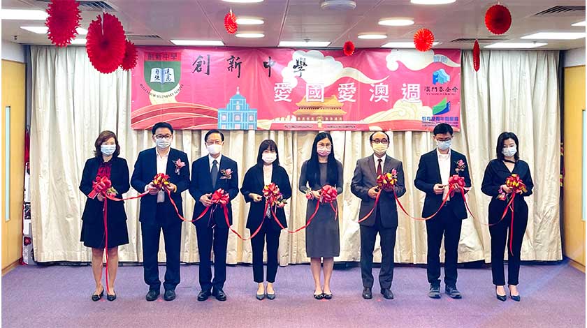 「愛國愛澳主題週」前日早假該校園舉行開幕儀式,儀式由澳門基金會特別計劃處處長梁雅桃、教育及青年發展局持續教育處處長譚惠嬌、創新中學校董霍志釗、創新中學校長崔寶峰、創新中學顧問葛萬金及楊兆貴教授、創新中學家長代表孫格芳主持(見圖)。系列活動包括「傳承中華文化園遊會」(主題工作坊:書法、國畫、毽子、剪紙、傳統小食、扯鈴、中國結及民族服裝),藉園遊會展示多項傳統中華文化藝術及民間技藝並讓學生參與其中;十二日舉行文化講堂《賣豬仔---澳門苦力港的血與淚》講座,讓學生了解澳門過往生活的苦況,從而更珍惜眼前澳門的繁華盛世;十三日參觀「澳門回歸賀禮陳列館」,透過觀賞澳門回歸賀禮,從中體會澳門回歸的歷史意義、參觀「青少年愛國愛澳教育基地」,培養本校學生對社會、國家的認同感和歸屬感、參觀「認識國家安全教育展」,讓本校學生共同維護國家安全和澳門的社會繁榮穩定;十六日將設攤位遊戲活 動,提升學生的愛國精神。