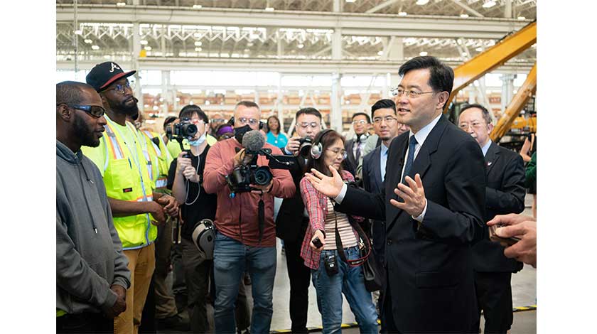 當地時間5月12日,中國駐美大使秦剛來到美國佐治亞州首府亞特蘭大附近的桃樹市,參訪三一重工美國公司總部。圖為秦剛在三一重工車間內向工人發表即席講話。( 中新社)