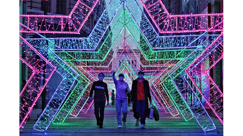 5月17日,黑龍江哈爾濱,市民在道外區中華巴洛克風情街上觀賞燈光秀,多樣的造型和燈光將街區裝扮得非常美麗。 中新社