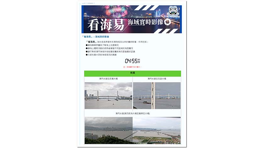 【特訊】為方便社會大眾隨時了解澳門的海上交通情況,加深居民對澳門海域的了解,海事及水務局在原有海面實況頁面的基礎上,推出“看海易”項目,讓公眾和海事業界可隨時了解澳門水道、內港錨地等,繁忙海域的情況,也可從特別的角度觀看海面實況。