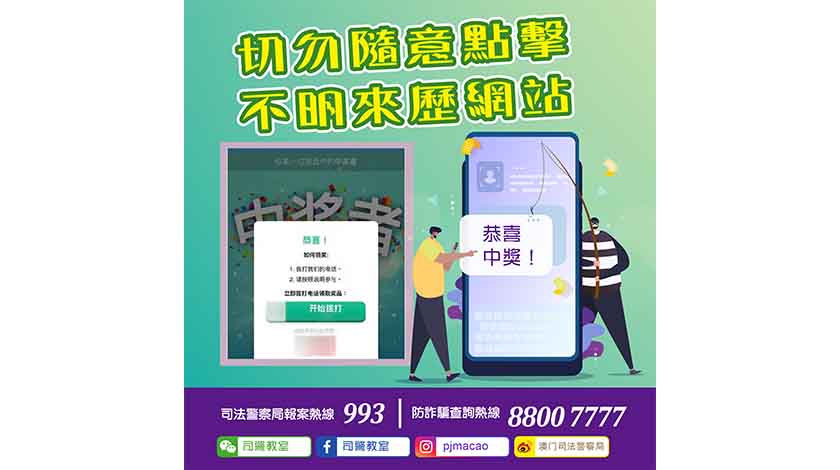 司警局至今並未接獲因上述情況而引致損失的案件舉報,但因騙徒手法層出不窮,故在此特別提醒市民,倘若收到來歷不明的網站連結,應提高警惕並小心求證相關內容,切勿登入不知名網站或提供個人資料。
