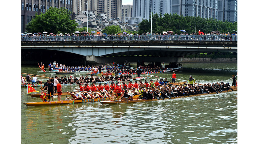 6月3日是中國傳統節日端午節,在福州市光明港,民眾劃槳競渡,享受劃龍舟的樂趣。 中新社