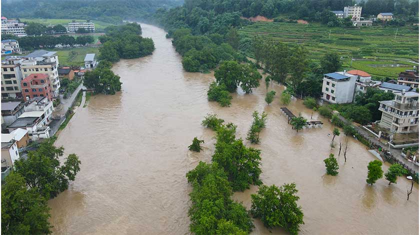 福建省中南部地區出現暴雨到大暴雨,北部沿海地區出現大雨到暴雨。福建省防汛辦7日通報稱,本輪降雨以來,全省已轉移人員14768人次,暫未接到重大災情報告。圖為福建省上杭縣部分河流水位大漲。(中新社)