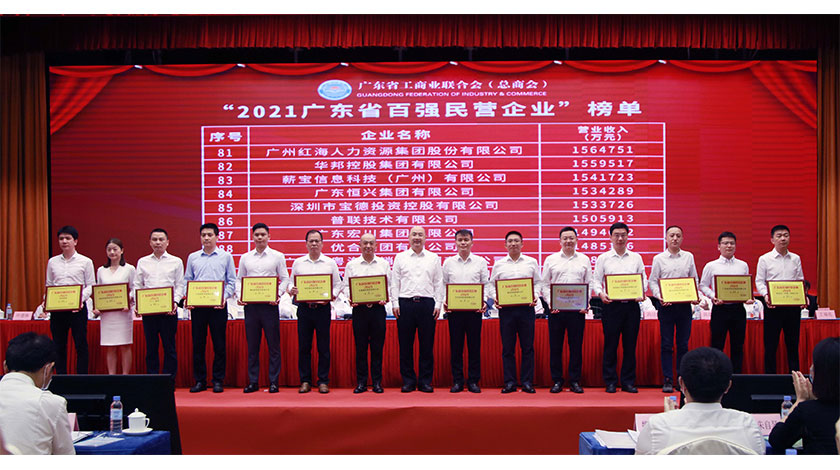 6月8日,廣東廣州,『2021廣東省百強民營企業』榜單發佈,華為投資控股有限公司位居榜首,正威國際集團有限公司和騰訊控股有限公司分別位列第二和第三位。圖為『2021廣東省百強民營企業』頒牌現場。 中新社