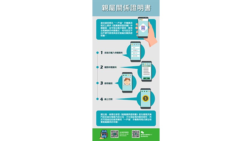 有關《親屬關係證明書》網上申請服務詳情,請瀏覽 www.dsi.gov.mo/webservice_c.jsp。