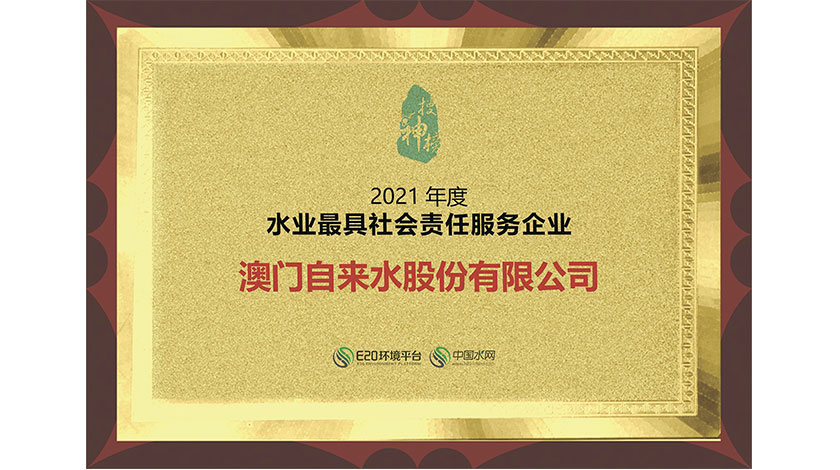【特訊】澳門自來水在一個由國內環保行業智庫E20環境平台聯合中國水網舉辦的2021年度(第十九屆)水業企業評選活動中,再次榮獲「最具社會責任服務企業」獎。自2012年第一屆評選以來,澳門自來水已連續10年獲得該獎項。