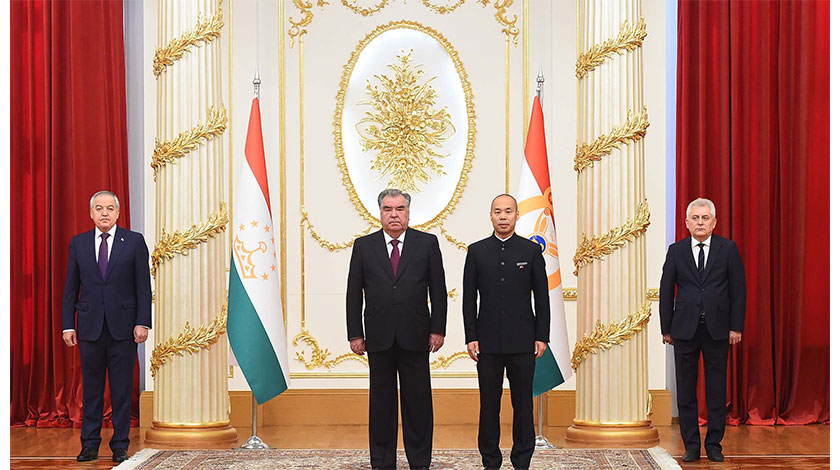 6月15日,在塔吉克斯坦首都杜尚別,中國新任駐塔吉克斯坦大使吉樹民(右二)向塔吉克斯坦總統拉赫蒙(左二)遞交國書後合影。塔吉克斯坦總統拉赫蒙15日說,中國是塔全面戰略夥伴和親密近鄰,發展對華關係是塔外交優先方向。 新華社
