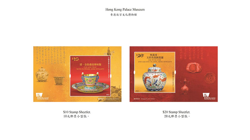 郵票小型張則分別展示“清•金胎畫琺瑯杯盤”及“明嘉靖•五彩魚藻圖蓋罐”,並以金黃色及朱紅色互相襯托。金黃色凸顯故宮的尊榮及輝煌歷史,朱紅色代表了故宮的紅牆,令郵品意涵豐富,更具收藏價值。