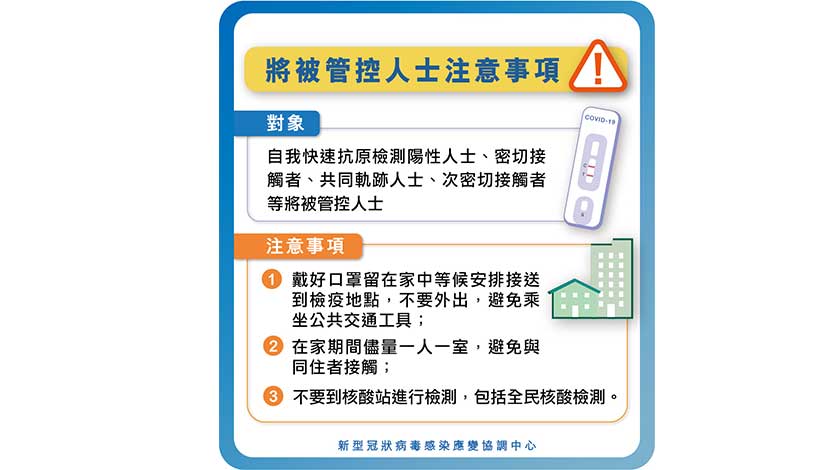 【特訊】新型冠狀病毒感染應變協調中心宣佈,因應疫情變化,並鑒於新冠病毒Omicron變異株感染潛伏期短,由今日開始調整本地疫情風險人群,包括核心密切接觸者、非核心密切接觸者(共軌人士)、次密切接觸者的管控措施如下: