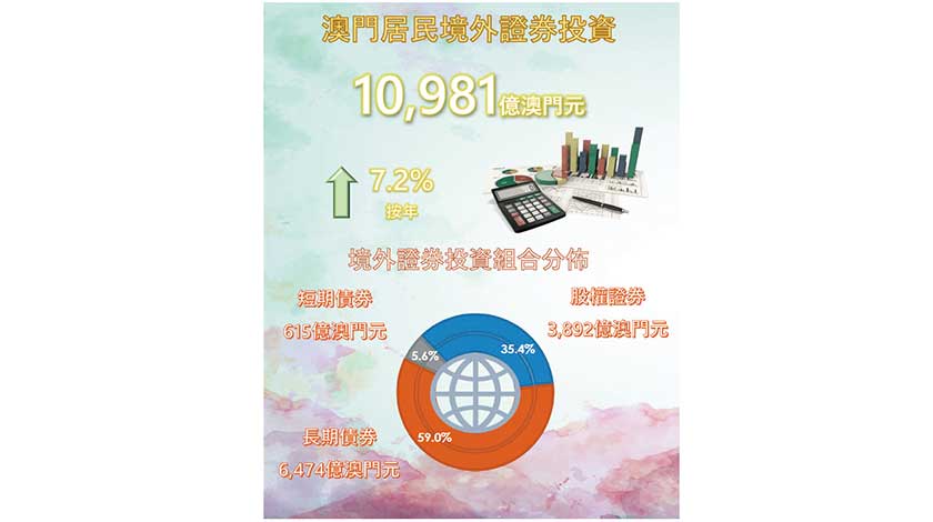 【特訊】澳門金融管理局昨天發佈的統計顯示,在 2021 年 12 月 31 日,澳門居民(包括個人、 政府及其他法人,但不含澳門特別行政區的外匯儲備)持有由境外無關連實體發行的 證券投資,以當天市場價值計算為 10981 億元(澳門元,下同),與 2021 年 6 月 30 日及去年同期比較,分別錄得 1.9% 和 7.2%的升幅。在各類證券投資中,股權證券 (包括互惠基金與投資信託單位)、長期債券及短期債券的市值分別為 3892 億元、 6474 億元及 615 億元,與 2020 年底比較,股權證券、長期債券及短期債券的市值分 別上升 12.4%、4.3%及 6.6%。