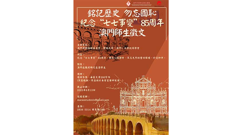 【特訊】為慶祝中國共產主義青年團成立100周年暨紀念“七七事變”85周年,由澳門學聯編輯委員會、暨南大學(澳門)文學院同學會聯合舉辦“銘記歷史勿忘國恥——紀念‘七七事變’85周年澳門師生徵文”活動,讓廣大青年學生充分瞭解這段抗戰歷史,緬懷先烈,圓夢中華。